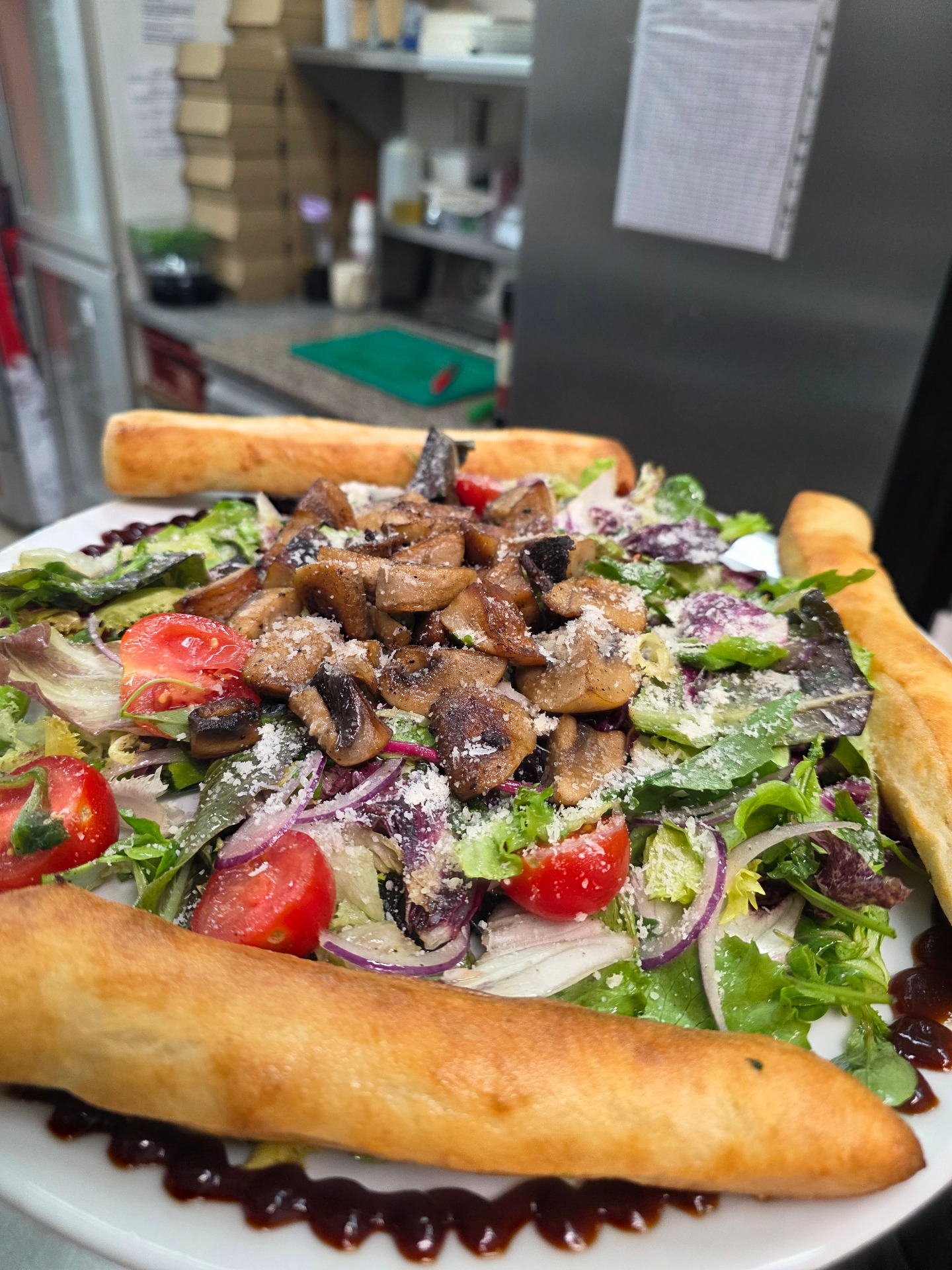 mix šalát, listový šalát, červená cibuľa, rukola, extra virgine oil, citrón,biraghi syr, grilovaný sampiňón, štangle